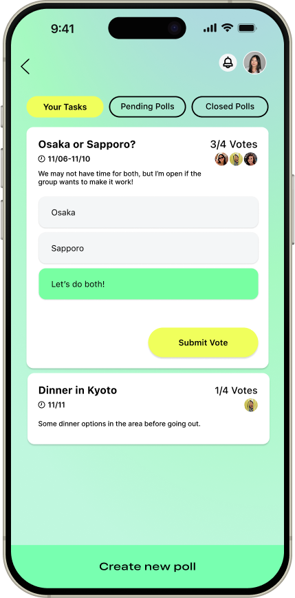 To maintain alignment throughout planning, I introduced an AI-generated vision board that aggregates the group’s preferences into a vision board. The visual updates dynamically as members join and is anchored at the top of the dashboard to continuously reinforce the group’s shared goal.